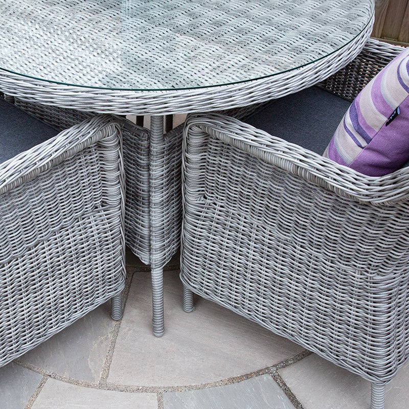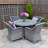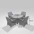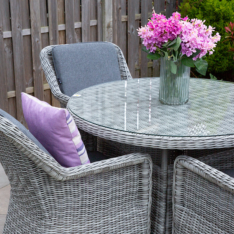 The round glass tabletop adds a sleek, contemporary finish and includes a central parasol hole — perfect for shaded dining during warm summer days. Four comfortable dining chairs, each with plush dark grey seat and back cushions, create an inviting space for relaxed meals or morning coffee. Combining style, comfort, and practicality, the Bordeaux 4 Seat Set is the perfect choice for effortless outdoor dining.