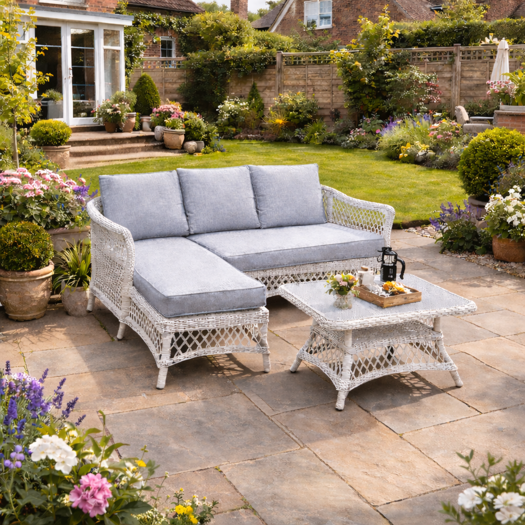 The ENJOi Classico Coffee Lounge Set combines timeless craftsmanship with relaxed contemporary comfort. Featuring a beautifully detailed white rattan weave frame with gently curved armrests and elegant lattice detailing, this set brings a refined yet inviting feel to any British garden setting.