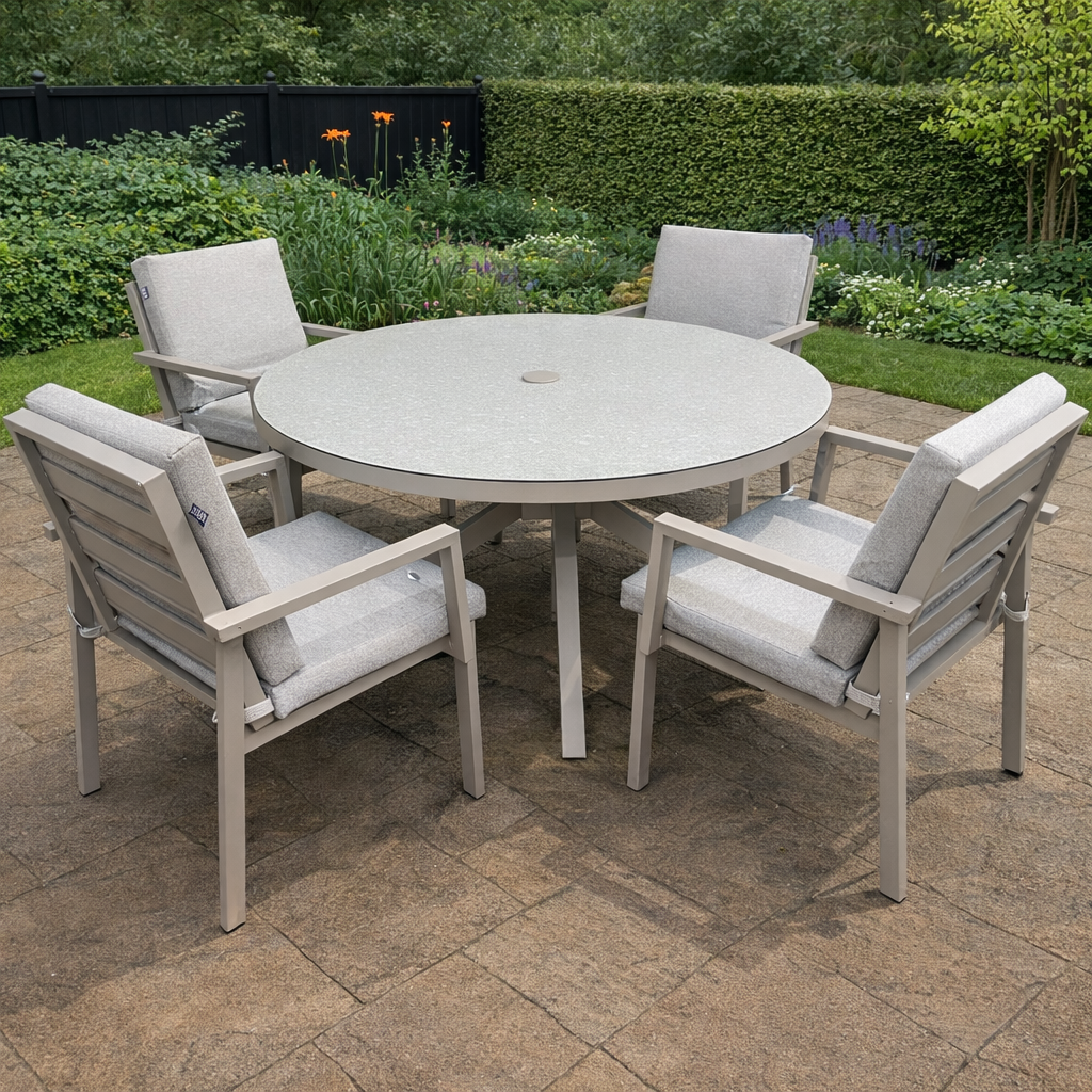 The ENJOi Havanna Natural 4 Seat Set blends elegant simplicity with modern practicality, creating a beautifully refined outdoor dining space. Built with a durable beige powder-coated aluminium frame, the set offers a soft, natural aesthetic that effortlessly complements any garden décor. The grey-beige cushions add subtle contrast and luxurious comfort, making every alfresco meal or morning coffee feel inviting and relaxed.