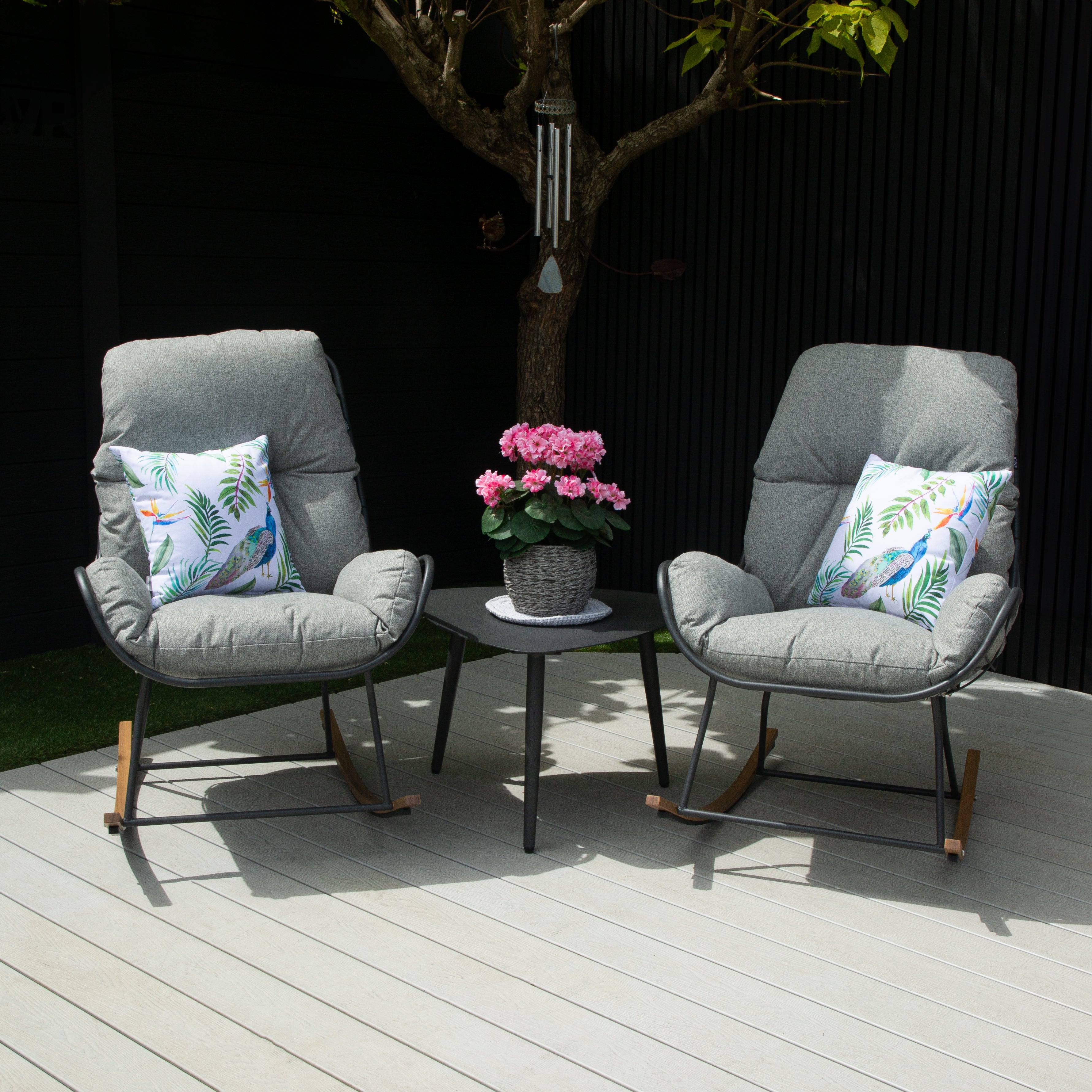 Unwind in contemporary comfort with the ENJOi Jive Rocker Duo Set. Designed for two, this modern rocking set blends style, comfort, and durability for the ultimate outdoor relaxation experience. Each chair is crafted from powder-coated aluminium for lasting strength, paired with polywood detailing that adds a refined, natural touch. The plush grey polyester cushions offer superior comfort and are designed to resist the elements, while the smooth rocking motion invites you to sit back and sway the day away. Perfect for patios, balconies, or cosy garden corners, the Jive Rocker Duo Set delivers effortless relaxation with modern flair.