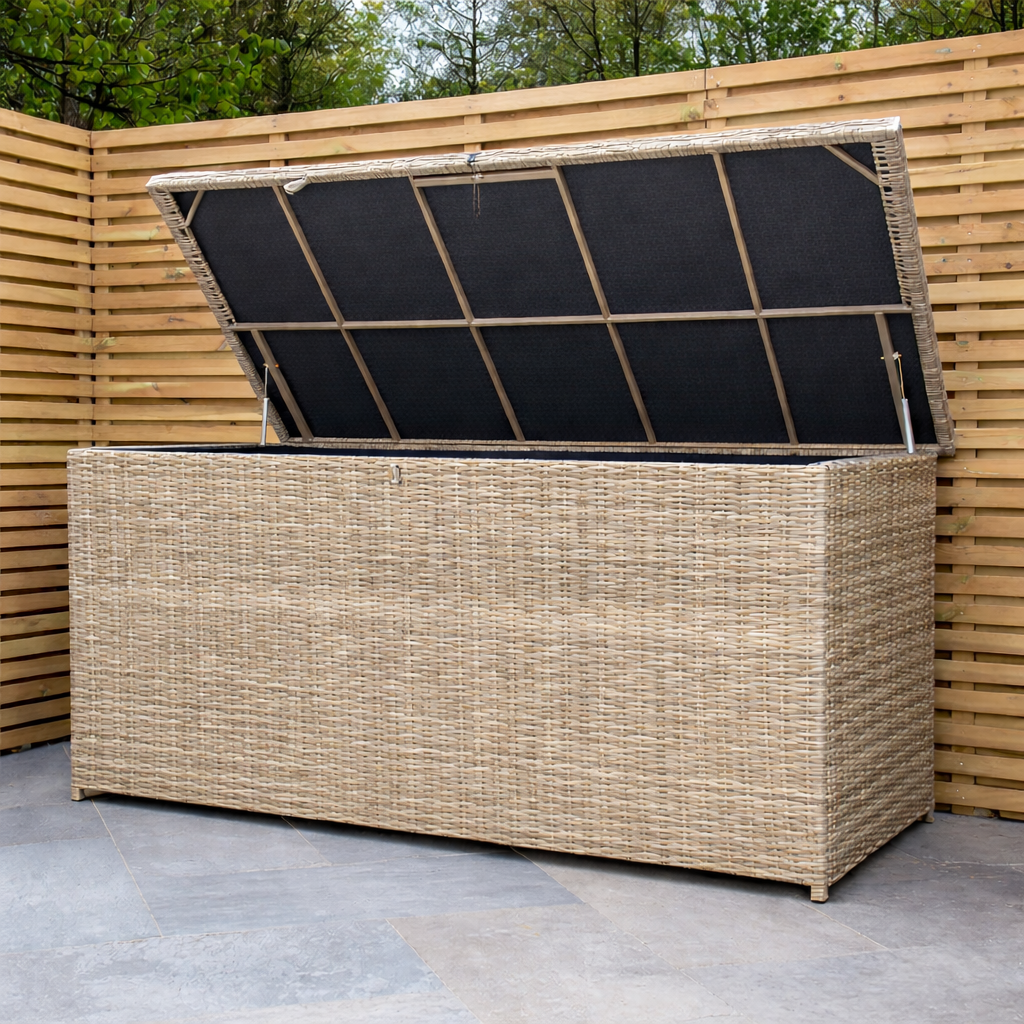 Generously sized at 1800mm wide, the cushion box provides ample room for storing seat cushions, throws, and outdoor accessories. The smooth lift-up lid is supported by durable internal hinges for easy opening and secure closing, while the fully lined interior helps protect your items from the elements. Crafted with a sturdy internal frame and weather-resistant rattan weave exterior, this cushion box is built for long-lasting outdoor use without compromising on style.